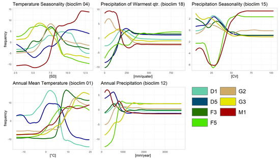 Partial dependence plots of the random forest model for prevalent CaPV classes: Western boreal Picea forests (D1) ‘petrol lines’; boreal and hemiboreal Pinus forests (D5) ‘dark-blue lines’; Mixed Quercus-Carpinus forests (F3) ‘dark-green lines’; Fagus and mixed Fagus forests (F5) ‘bright-green lines’; sub-Mediterranean-subcontinental thermophilous Q. cerris and Q. frainetto forests (G2) ‘light-brown lines’; sub-Mediterranean and meso-supra-Mediterranean Q. pubescens forests (G3) ‘yellow lines’ and true steppes (M1) ‘dark-red lines’.