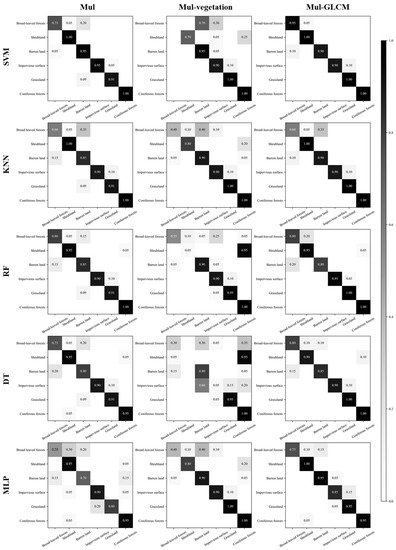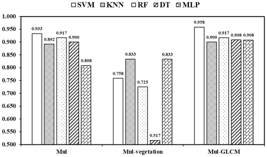 - The spatial distribution of forest land resource information based on five classifiers based on Mul: