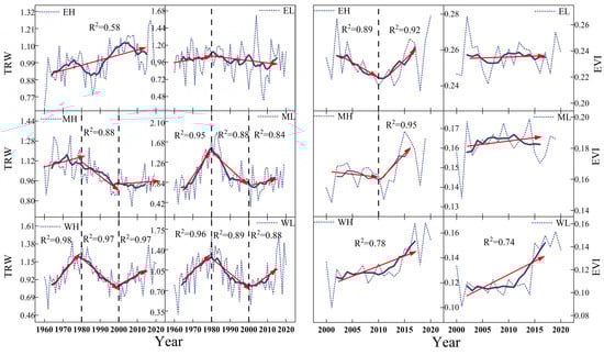 4.2. Spatial and Temporal Patterns of TRW and EVI Relationships