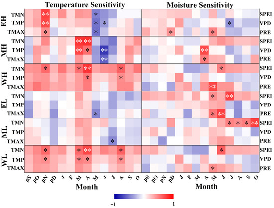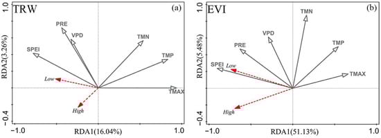 3.3. Response Analysis of TRW and EVI to Climate Factors