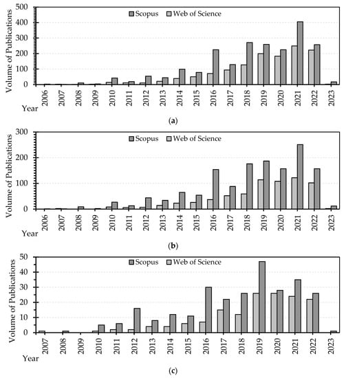 Despite some peaks and valleys in some periods, the volumes of publications clearly demonstrate annual growth trends for the three raised conditions (Figure 1a–c). It is also possible to state that cross-laminated timber has shown growing scientific interest over the last ten years. Due to the greater interest in wood product utilization by construction, these scenarios suggest a stable increase in the near future, insofar as some publications were already confirmed for 2023 still during the period of analysis in December 2022.