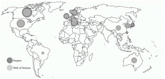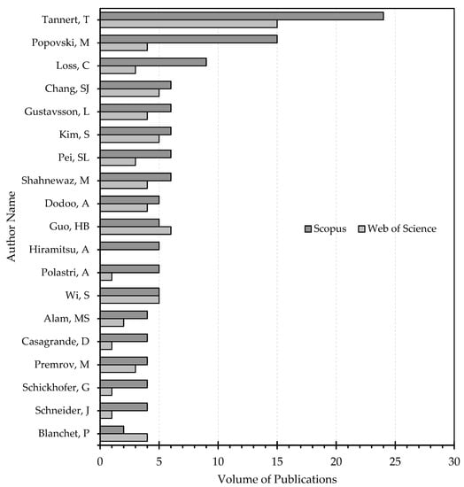 In the specific condition, over 275 publications are already available in Scopus and over 150 are indexed by the Web of Science database (Table 2). Regarding authorship scope, nineteen authors exceed three or more studies on cross-laminated timber for residential application, the majority of which were presented by professors of Canadian institutions of the British Columbia province: Dr. Thomas Tannert, Dr. Marjan Popovski, and Dr. Cristiano Loss (Figure 2). This consistent presence justified the greater concentration of research studies from Canada (Figure 3). Canadian leadership is followed by the United States, Italy, Sweden, the United Kingdom, and Australia.