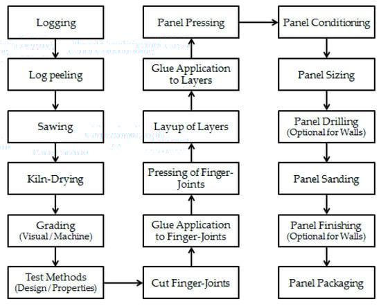 Regarding cross-laminated timber production (Figure 6), Gagnon and Pirvu [14], Lightwood [97] and Kurzinski et al. [98] specified that a typical manufacturing requires: