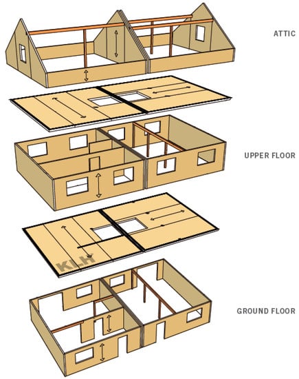 The construction application takes place in different manners with cross-laminated timber. A modular house is an example of contemporary timber housing, identified by De Araujo et al. [41], whose construction system can be made from prefabrication of panels, components or volumes, as exemplified by Pique Del Pozo [86].
