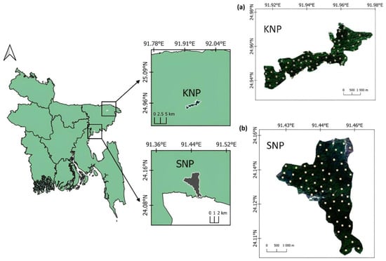Location map of two studied protected areas (a) Khadimnagar National Park (KNP) and (b) Satchari National Park (SNP) in Northeast Bangladesh. The yellow dots indicate the plot location within each of the study areas.