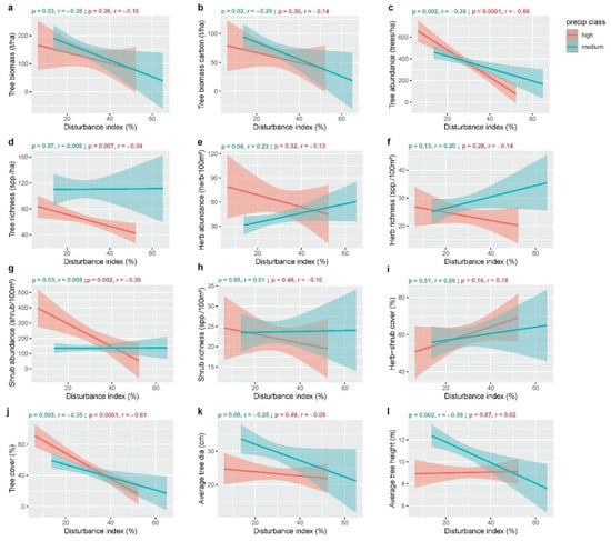 Average tree height (m) and average tree diameter at breast height (cm) were considered as indicators for timber production in our study (Table 1). The correlation analysis showed that the disturbances had no significant association with the average tree diameter under the high- (p = 0.06, r = −0.25) or medium (p = 0.49, r = −0.09)-rainfall classes (Figure 2k). However, the interactive effects of disturbances and rainfall class were significant on tree height (p = 0.01, Table 2). The average tree height showed a significant negative correlation with a disturbance gradient in the medium-rainfall class (p = 0.002, r = −0.39), whereas no significant (p = 0.87, r = 0.02) relation was found in the high-rainfall class (Figure 2k,I).