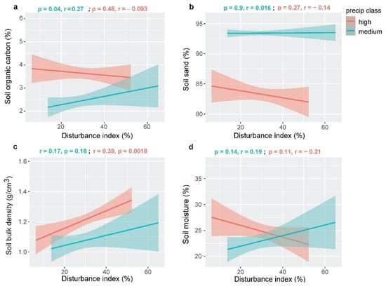 Soil organic carbon (%) was the indicator of soil organic carbon storage in our study (Table 1). Rainfall class had significant effects on soil organic carbon storage (p < 0.0001, Table 2). Belowground organic carbon storage was positively correlated (r = 0.27) with disturbance gradients and it was significant (p = 0.04) in the medium-rainfall class. On the other hand, the correlation between disturbances and belowground carbon storage was not significant (p = 0.47, r = −0.10) in our study in the high-rainfall class (Figure 3a).
