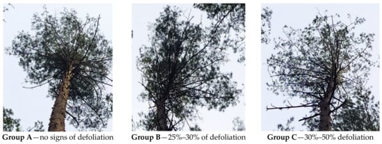 - Group C—trees weakened, partially discolored or completely discolored crowns with a notable reduction in needles from 30% to 50%.