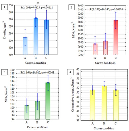 Despite that only a few investigations have been made, the obtained research results are very interesting in the context of both literature reports and planned research (Figure 3). For the analyzed mechanical properties determined in the bending test, quite clear statistical differences between the mean values were observed. What is particularly interesting is that the group of trees characterized by the highest defoliation has the highest values of the investigated features. However, despite the fact that samples from group A had a significantly lower density when compared with samples from group B, both MOR and MOE of wood obtained from the trees belonging to group A (so-called healthy trees) and B (with a defoliation of 30%) were very similar. At this stage of stand dieback, spectacular changes in the mechanical properties of wood, which, according to the literature, can be observed in the later period of degradation, have not yet been confirmed [,]. At present, based on the preliminary results, too few samples were collected to make unambiguous conclusions on the impact of tree dieback on the quality changes in the raw material. The observed relationships cannot be fully explained by the difference in the density of wood obtained from the selected model trees. The results of the compressive strength test performed so far indicate a significant change in strength properties. Healthy trees with a lower density showed a similar level of strength as the trees characterized by major crown damage above 30%, which can indicate the deterioration in the quality of wood harvested from dying stands. Currently, the selected model trees show a relatively good condition, which translates into the observed mechanical properties. Although these values are high, the dependencies on the degree of defoliation are no longer unequivocal. Therefore, a broader look at the problem of tree dieback and wood quality is required as numerous studies confirm that it undergoes significant decomposition in the long term [,,].