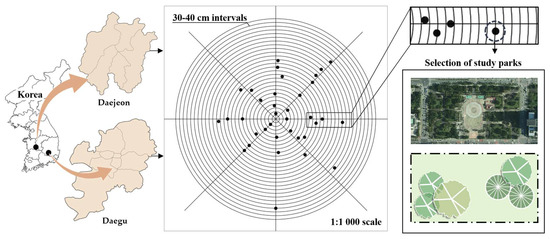 For this study, sample parks were selected using systematic sampling from 1:1000 scale aerial photographs of the study cities (Figure 1). Radial lines were drawn on the photographs in eight directions, intersecting at the city center. Annular circles were then drawn at intervals of 40 cm for Daejeon and 30 cm for Daegu, considering the different sizes of the cities. Moreover, the parks in contact with the radial line and annular circle or closest within 500 m from the point of contact were selected as the study sites. This site sampling method was developed by Jo et al. [8] to fairly select study parks on a city-wide scale.