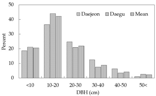 The planting density of trees in the study parks was 3.0 ± 0.2 trees/100 m2 in Daejeon and 3.8 ± 0.4 trees/100 m2 in Daegu (Table 4). The overall average of the two cities was 3.5 ± 0.2 trees/100 m2. Regarding tree density per park, 3 trees or fewer/100 m2 accounted for 49.3%, followed by 3–5 trees/100 m2 at 34.3%, and 6 trees or more/100 m2 accounting for 16.4%. The basal area of the planted trees ranged from 347 to 1976 cm2/100 m2, with an average of 1019 ± 49.6 cm2/100 m2. Tree basal areas of 1000–1500 cm2/100 m2 in the study parks were the highest with 40.3%, followed by 500–1500 cm2/100 m2 with 31.3%, and 500 cm2 or less/100 m2 with 17.9%. The average DBH of planted trees was 18.4 ± 0.6 cm; the DBH distribution was 62.8% for 20 cm or less, 21.9% for 20–30 cm, and 15.3% for 30 cm or more (Figure 2). The cover of planted park trees and shrubs ranged between 12.1 and 76.4%, with an average of 43.1 ± 2.2%. The planting density, basal area, and cover of trees in Daejeon and Daegu did not exhibit a statistically significant difference (p > 0.05).