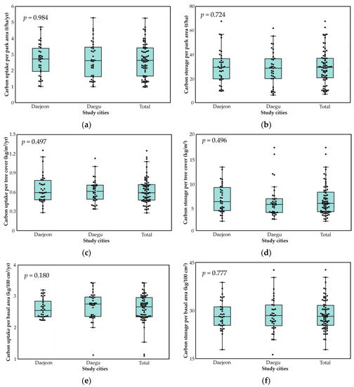 A carbon indicator that can easily quantify carbon uptake and storage is required to develop a carbon-neutrality policy that leverages urban parks. Existing studies on urban parks have established a carbon indicator for carbon offset services mainly based on park area or tree cover [8,9,19,20,21,22]. The carbon uptake per unit of park area and crown cover of urban parks in Seoul was 3.5 t/ha/yr and 0.7 kg/m2/yr, respectively, which was higher than the estimates of this study (2.6 t/ha/yr and 0.6 kg/m2/yr) [8]. The carbon uptake per unit area of urban parks in Dhaka was 5.3t/ha, which was twice higher than these study parks [9]. The carbon storage per unit area of the urban parks in Hamburg and Helsinki was 59.8 t/ha and 28.1 t/ha, respectively [36,37], which were similar to, and approximately double, the estimate from this study (29.9 t/ha). The carbon uptake and storage per tree cover in urban greenspaces in the United States were 0.28 kg/m2/yr and 7.69 kg/m2, respectively [23]. In Korea, the carbon uptake per unit area of multifamily residential gardens was 1.1 t/ha/yr [59]. Noticeably, the carbon indicator in urban parks differs greatly between countries. These differences are attributed to differences in geographic and natural growth environments, quantitative models that have been applied, sampling methods, and tree planting structures. Furthermore, even within the same country, the carbon uptake and storage for each type of greenspace, such as parks, gardens, and street trees, exhibited a difference of up to four times. This demonstrates that a reasonable carbon indicator by country, city, and type of greenspace needs to be developed to quantify the carbon reduction service of urban greenspaces. Meanwhile, the carbon uptake and storage per unit of park area, crown cover, and basal area for the study parks were similar by city. This is presumably due to the tree planting structures in Daejeon and Daegu being similar. Specifically, as described above, no statistically significant difference in the tree cover and basal area between Daejeon and Daegu was observed.