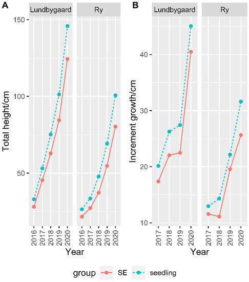 - The cumulative final heights of the years 2016, 2017, 2018, 2019, and 2020 were obtained after 2, 3, 4, 5, and 6 growing seasons, respectively; thus, the annual height increments of the years 2017, 2018, and 2019 were recorded.