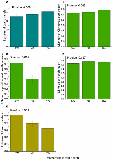 | Christmas tree quality | 6 | <0.001 | <0.001 | 3.5 (0.10) | 2.8 (0.08) | 3.6 (0.08) | 0.17 (0.05) | 0.16 (0.04) | 0.09 (0.02) |