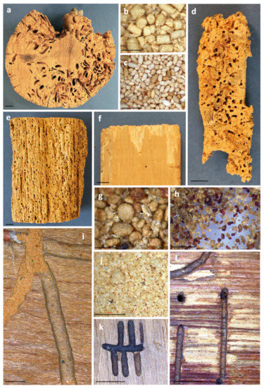 Galleries, exit holes, and dust excrements of several widespread wood-deteriorating beetles in Europe. (a) Cross-section of a utility pole with oval galleries bored by Hylotrupes bajulus (Cerambycidae). Note that galleries are present in sapwood only. Bar = 10 mm. (b) Cylindrical dust excrements characteristic of Cerambycidae. Bar = 1 mm. (c) Dust excrements of Anobium punctatum (Anobiidae). Bar = 1 mm. (d) Piece of a wooden pillar attacked by members of Curculioninae (Curculionidae). Bar = 10 mm. (e) Piece of wood heavily attacked by members of Anobiidae. Bar = 10 mm. (f) Piece of a skirting board attacked by members of Lyctinae (Bostrichidae). Note the presence of longitudinal galleries covered by dust. Bar = 10 mm. (g) Dust excrements of Xestobium rufovillosum (Anobiidae). Bar = 1 mm. (h) Dust excrements characteristic of Curculioninae (Curculionidae). Bar = 500 μm. (i) Detail of a larval gallery bored by members of Lyctinae (Bostrichidae) and partially filled with dust excrements, which are soft to the touch. Bar = 2 mm. (j) Detail of the amorphous dust excrements characteristic of Lyctinae (Bostrichidae). Bar = 1 mm. (k,l) Galleries and exit holes bored by members of Scolytinae (Curculionidae). Note the dark staining of the galleries as a consequence of the growth of ambrosia fungi. Bar = 10 mm.
