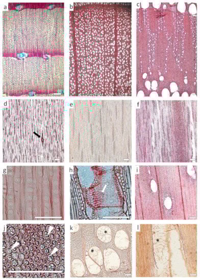 Vessels are often plugged with tyloses and gums (Figure 8k,l), particularly in the heartwood, which hinders accessibility for microorganisms. The transition from sapwood to heartwood is marked by the death of parenchyma cells and vessel occlusion with tyloses or gums and the aspiration of pits. These physical barriers may prevent or slow down the spread of pathogens and wood-decay agents, as well as compartmentalize the xylem after wounding in the living tree [170]. Tyloses are overgrowths of the protoplast of adjacent living ray parenchyma or paratracheal parenchyma cells (Figure 8i) into vessels and occasionally tracheids and fibers. They plug vessels, which can no longer conduct water, and can contain a wide variety of organic and mineral compounds, including gums, resins, starch, crystals and suberin [170]. Some fungi cannot penetrate occluded vessels and expand tunnelling through cell walls, while others, by contrast, preferentially degrade the polyphenolic occlusions in the cell lumina [164]. Gums include several secondary metabolites with variable chemistry and can be of chemotaxonomic interest [158]. Gums have been reported to form after the production of gels where pathogens have released pectinolytic and cellulolytic enzymes [171]. The high content of gums filling cell lumens in the heartwood of Prosopis africana limited the penetration of water and was related to its high natural durability [172].