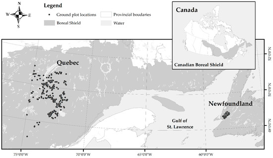 Two study areas were selected based on their similarity in forest composition: both are conifer-dominated and lie within the eastern extent of the North American boreal forest [60] (Figure 1). The forests are comprised of balsam fir (Abies balsamea (L.) Miller), black spruce (Picea mariana [Miller] Britton), white spruce (Picea glauca [Moench] Voss), paper or white birch (Betula papyrifera Marshall), yellow birch (Betula alleghaniensis Britton) and, to a lesser extent, tamarack, or eastern larch (Larix laricina [Du Roi] K. Koch). Balsam fir and white spruce-dominated mixed stands are found south of the 50th parallel in our first study area (123,140 km2), located in the province of Quebec. As we move north, the presence of black spruce increases until it completely dominates the landscape above the 52nd parallel. The second study area (977 km2) is in the most eastern extent of the Boreal Shield Ecozone, in the province of Newfoundland and Labrador, and is dominated by balsam fir. The climate at both sites is favorable for forest growth due to abundant precipitation and warm summers. The primary silvicultural treatments practiced in these areas are pre-commercial thinning and clear-cut harvesting, which generally yield even-aged, homogeneous forest stands.