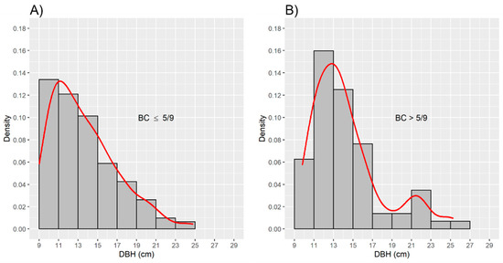 Example of Stem Diameter Distribution (SDD) differentiated according to the Bimodality Coefficient (BC) as (A) unimodal and (B) bimodal, and respectively fitted with a Weibull distribution and a Finite Mixture Model (red lines).