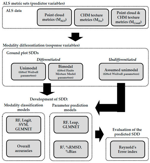 Figure 3 provides an overview of the methodological approach of the study. We used the ground-plot data to develop area-based models (i) to classify SDD modality and (ii) to predict SDD function parameters. We first defined three sets of ALS metrics from the ground plot locations (Mals, Mtex, and Mcomb). We then created three ground plot datasets: the first two, unimodal and bimodal, were differentiated based on the modality of the SDD, while the third group was undifferentiated and assumed all plots were unimodal. Within each of the differentiated modality groups, we randomly selected 70% of plots for model development and used the remaining 30% as test cases. We developed models using 70% of the model development data for training and the remaining 30% for evaluating model performances. We generated three sets of models for each of the ground-plot groups using the ALS metrics sets. We used the modality and associated Weibull parameters as response variables for the SDD modality classification models and the SDD parameter prediction models, respectively. We implemented our best-performing models on our reserved test case data and analyzed the contribution of the CHM texture metrics to both groups of models (classification and prediction). Finally, we compared the predicted SDD that was obtained from the differentiated and undifferentiated modality models to assess whether modality differentiation improved the prediction of SDD in our data. All calculations were performed in R [66].
