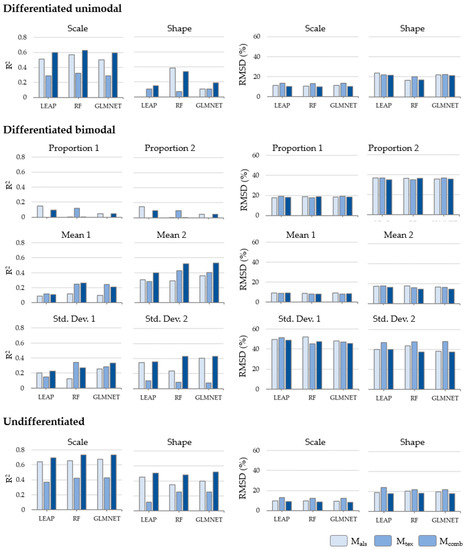 The development of models using the undifferentiated modality SDD plot data involved applying the unimodal fitting analysis to all plots, regardless of modality. Herein, models performed better for the scale parameter (R2: 0.37–0.73; RMSD%: 8.4%–12.9%) than for shape (R2: 0.12–0.52; RMSD%: 17.7%–23.9%). We consistently observed improvements in model performance associated with models that have been developed with Mcomb. Scale was best predicted with LEAP (R2: 0.73; RMSD%: 8.4%), while shape was best predicted with GLMNET (R2: 0.52; RMSD%: 17.7%). For these models, we observed a mean increase in R2 of 0.08 (SD: 0.03) and a mean decrease in RMSD% of 1.3% (SD: 0.6%) with models that were developed using Mcomb over those developed using Mals.