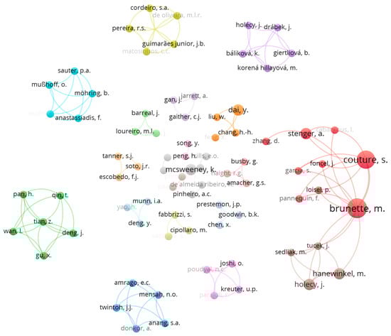 The 38 articles are written by 80 authors. In Figure 2 we propose to take the name of the authors and look at their number of occurrences (size of the circle) and the links between them (the size and number of links). The size of the circle is proportional to the number of occurrences of the author’s name. The names are linked together if they appear at least one time in the same publication, and the thickness of the link between names is proportional to their number of co-occurrences. The colors allow us to identify clusters of authors. We created Figure 2 with VOSviewer, an open-access software tool developed to construct and visualize bibliometric networks [15]. We used this software to easily and fashionably visualize the links (in terms of publications) between the authors (Figure 2) and the keywords (Figure 3).