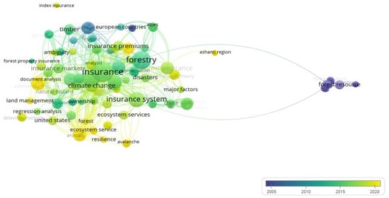Not surprisingly, the two words with the highest number of occurrences are “insurance” and “forestry”. We also find “insurance system” and “climate change”. Topics related to forest resources and European countries are in blue (the older, in 2005), whereas the occurrences in yellow (more recent, in 2020) deal with ecosystem services and resilience.
