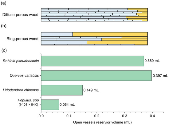 The estimated volume of cut-open vessels. (a,b) are the diagrams of open vessels for diffuse-porous and ring-porous tree species in this study, respectively. Blue and yellow represent intact and open vessels, respectively. (c) The estimated volume of open vessels reservoir is based on the silicone injection technique. For each species, the estimation was made based on the average value of diameter and numbers of injected vessels (n = 5 branches).