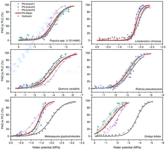 Vulnerability curves (VCs) of six tree species constructed by Pneumatic and hydraulic methods. PN-branch1, PN-branch2, and PN-branch3 represent three branches per species used for the construction of Pneumatic VCs. PN-mean represents plotted VCs using mean fitted values of three branches.