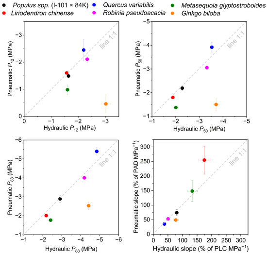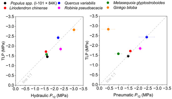 Relationship between the leaf water potential at turgor loss point (TLP) and P12 measured with the hydraulic and pneumatic methods. The grey dashed line represents the 1:1 line. Vertical and horizontal bars represent standard error.