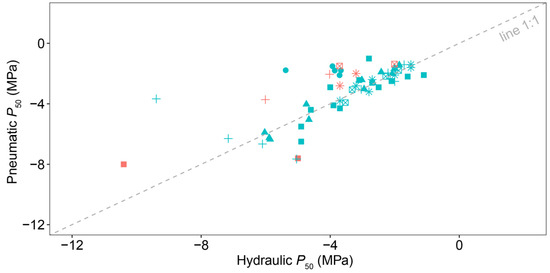Synthesis of hydraulic or pneumatic P50 data of 56 species. Grey dashed line represents the 1:1 line. Red and cyan points represent tracheid-bearing and vessel-bearing species, respectively. Different symbols represent different data sources: ■ Pereira et al. (2016), ✴ Zhang et al. (2018), + Sergent et al. (2020), ▲ Paligi et al. (2021), ● Chen et al. (2021), ⊠ This study.