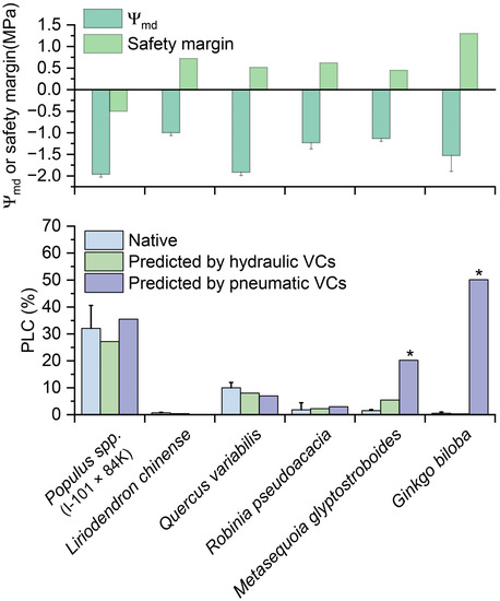 The midday xylem water potential (Ψmd) and the native or predicted percentage loss of conductivity (PLC). * indicates significant difference between predicted PLC and native PLC (p < 0.05). Vertical bars represent standard error.