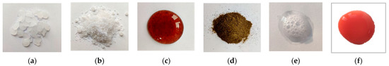 Images of additives to water and fire extinguishing agents: (a) bischofite; (b) OS-5; (c) FR-Les solution; (d) bentonite; (e) foaming agent emulsion; (f) fire retardant solution.