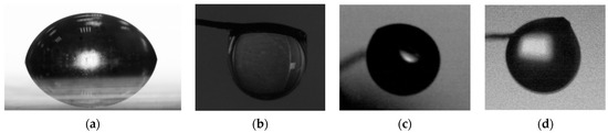 A droplet of the composition under study was generated at a random point using a dispenser. Shadowgraphs of droplets were obtained using the light source 1 and the high-speed video camera 6. The droplet volume in the experiments on wetting was constant at 10 μL. The contact radii of droplets with a volume of 10 μL did not exceed the capillary constant (L) of the compositions under study. Under these conditions (r ≤ L = γ/(ρ∙g)), the size of the droplet determining the gravity acting on it had no effect on the static contact angle. The geometric characteristics of droplets (contact angle (θ), diameter (d) and height (h)) were determined at the initial moment of their interaction with the steel surface using the method from [39].