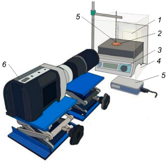 Experimental setup: (1) light source; (2) investigated surface; (3) PLK-1818 hot plate; (4) box; (5) thermocouple; (6) high-speed camera.