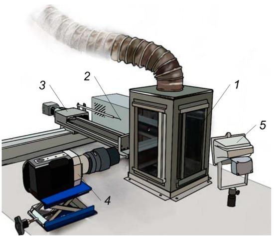 Experimental setup: (1) convective channel; (2) holder; (3) positioning mechanism; (4) high-speed video camera; (5) light source.