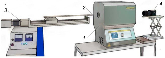 Experimental setup: (1) muffle furnace; (2) holder; (3) positioning mechanism; (4) high-speed video camera.