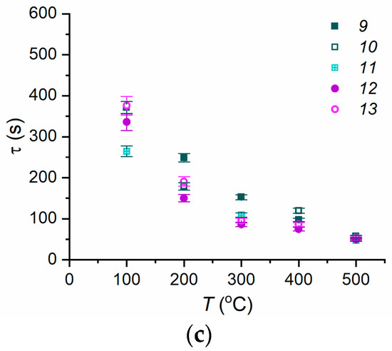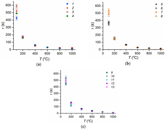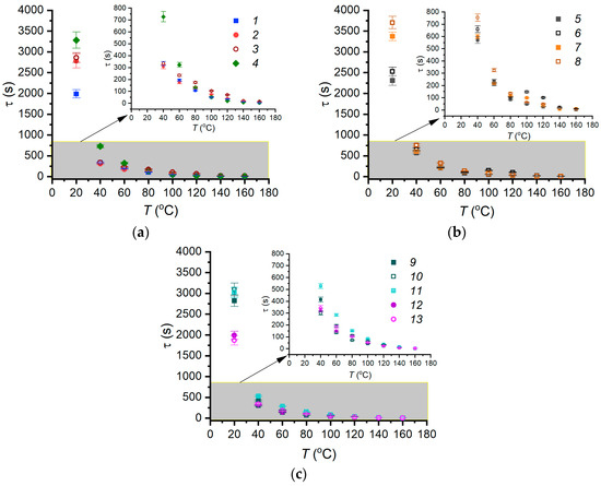Evaporation time of 10-μL droplets of fire extinguishing agents and water when varying the air temperature in the muffle furnace: (a) 1—water; 2—flame retardant FR-Les (5% solution); 3—FR-Les (20% solution); 4—fire retardant (5% solution); (b) 5—bentonite slurry (1%); 6—bentonite slurry (5%); 7—bischofite solution (5%); 8—bischofite solution (10%); (c) 9—fire extinguishing agent OS-5 (5% solution); 10—OS-5 (10% solution); 11—OS-5 (15% solution); 12—foaming agent emulsion (1%); 13—foaming agent emulsion (5%).