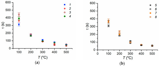 Figure 7, Figure 8, Figure 9 and Figure 10 show the times of complete evaporation of specialized fire extinguishing agent droplets as a function of the steel substrate surface temperature during conductive heating and as a function of the air temperature during convective, radiant heating and heating over the open flame of the burner.