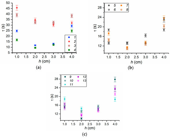 Evaporation time of 10-μL droplets of fire extinguishing agents and water when varying the height of the droplet position above the open burner flame: (a) 1—water; 2—flame retardant FR-Les (5% solution); 3—FR-Les (20% solution); 4—fire retardant (5% solution); (b) 5—bentonite slurry (1%); 6—bentonite slurry (5%); 7—bischofite solution (5%); 8—bischofite solution (10%); (c) 9—fire extinguishing agent OS-5 (5% solution); 10—OS-5 (10% solution); 11—OS-5 (15% solution); 12—foaming agent emulsion (1%); 13—foaming agent emulsion (5%).