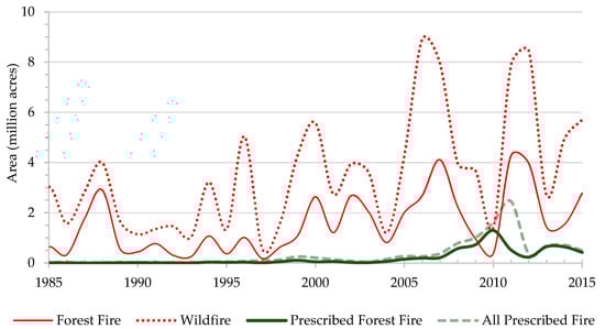 Wildfire is an issue that impacts the ecology, economy, safety, and security of ecosystems as well as human welfare. Every year, billions of dollars are spent suppressing and controlling catastrophic wildfires. In 2017, the estimated U.S. economic loss due to wildfire was USD 23 billion, an increase of 12% since 2008 [1]. In the same year, 3400 lives were lost, and 14,670 people were injured by the U.S. wildfires [1]. After the ‘Big Blowup’ (a devastating series of forest fires in 1910 that burned 3 million acres in Montana, Idaho, and Washington), total fire suppression (including a halt of controlled burns) became a major policy focus of the United States Forest Service (USFS). As a result, biomass fuel (i.e., standing and downed deadwood in addition to standing live biomass) accumulated and increased the occurrence and ferocity of wildfires in a range of American wildlands [2,3]. As a result, the number of large fires increased by seven per year and 355 km2/year between 1984 and 2011 in the west [4]. Figure 1 shows the area burned between 1985 and 2015 [3]. Though fires are an integral part of natural ecosystems, studies have suggested that human influence, either directly through ignition source [5] or indirectly through management [6] and climate change [7], have altered wildfire dynamics. Consequently, this suppression policy may have altered wildfire behavior to a point where they are no longer a natural process in the U.S. [8,9].