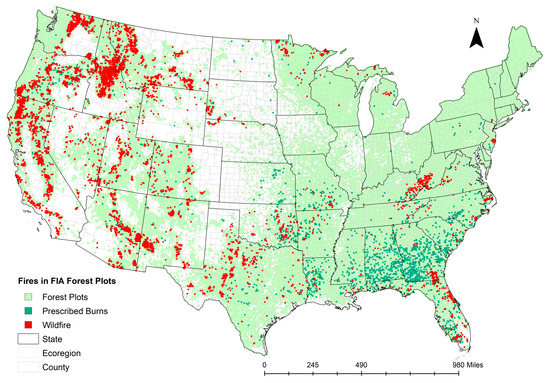 FIA forested plots with historic wildfires and prescribed burns between 2000 and 2015 [3,26].
