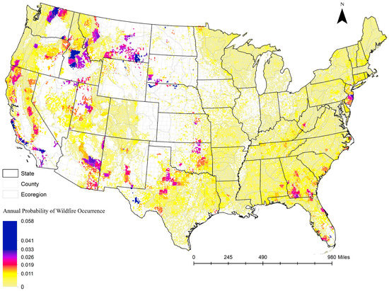 Annual probability of wildfire occurrences in FIA forest plots estimated using the fire risk equation across the continental United States. (Raster map download link: https://www.canr.msu.edu/socioeconomics/econ/data, accessed on 13 November 2022).
