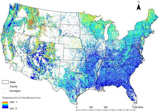 Proportion of live tree mortality in FIA forest plots predicted using TreeBio-Loss equation across the continental United States. (Raster map download link: https://www.canr.msu.edu/socioeconomics/econ/data, accessed on 13 November 2022).