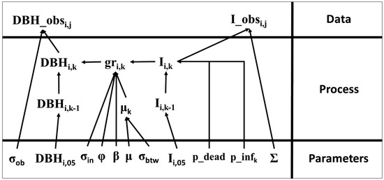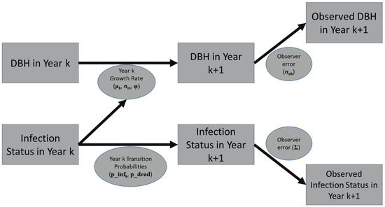 Tree DBH and infection status were modeled latently for every tree in the study based on the preceding relationships. Observed values for these variables were modeled assuming observer error. Observed DBH was modeled as a normal distribution with mean equal to the latent DBH value and a common variance parameter representative of observer error. Observed infection status (healthy, infected, or dead) was modeled as a multinomial distribution with probabilities for each category determined by the latent infection status of the tree, P(Observed status | latent status). Model variables, latent and observed, and model parameters are given in Table 1. A diagram of the dynamic process model is given in Figure 2.
