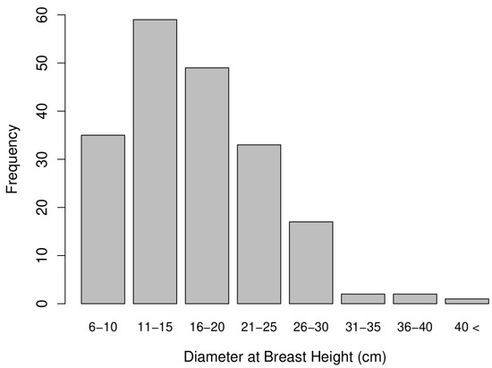 Frequency histogram of DBH in 2007, the year with the most complete data. The distribution of DBH did not change significantly over the period of the study.