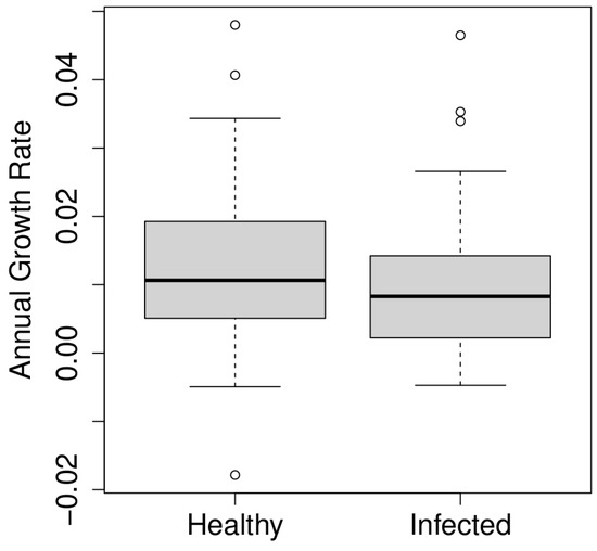 Here, 190 growth rates were estimated from the data for observed DBH. Estimated absolute growth rates ranged from 0 to 0.87 cm/yr for healthy trees and 0 to 0.69 cm/yr for infected trees, while relative growth rates ranged from 0 to 0.048 cm/cm/yr for healthy trees and 0 to 0.047 cm/cm/yr for infected trees. (Due to observer error, some trees were estimated to have a negative growth rate. These are not reported here but are shown below.) The distribution of growth rates for uninfected and infected trees is shown in Figure 5.