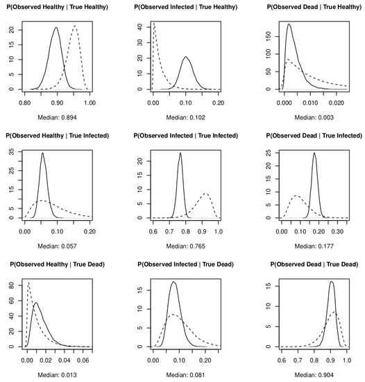 Location statistics—mean, median, and 95% highest-density credible interval—for key model parameters are reported in Table 2 and marginal posterior distributions are shown in Figure 6. Figure 7 shows the posterior distributions for the observed infection status probabilities along with the prior distributions, and Figure 8 shows the multinomial probabilities for assessed infection status based on latent status.