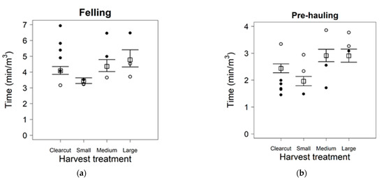 Time consumption per m3 for (a) felling and (b) pre-hauling operation in each harvest treatment. Small, medium, and large indicate 10, 50, and 100 retained trees/ha, respectively. Squares and bars show back-transformed least squares means and SEs, respectively. Dots represent values from each study site, where black or white circles denote different contractors.