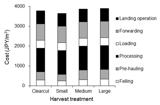 The direct operational cost (JPY/m3) for each operation was estimated using time consumption (h/m3) and hourly operational expenses for labor and machinery [26,27]. Labor expenses were set to JPY 2550/h (USD 19.77/h) [24]. Machinery expenses were set to JPY 448/h (USD 3.47/h) for the chainsaw, JPY 4497/h (USD 34.86/h) for the grapple loader, JPY 10,308/h (USD 79.91/h) for the harvester, and JPY 5979/h (USD 46.35/h) for the forwarder [19]. The exchange rate was USD 1 = JPY 129 on 2 February 2023. Machinery expenses consisted of costs for depreciation, management, maintenance, fuel, and oil. These were calculated from economic data in Table 1. Because the aim of estimating operational cost is to examine the net impact of dispersed retention on total cost to roadside, we standardized time consumption using the least squares means for felling and pre-hauling, and using means of all study sites for the other operations.