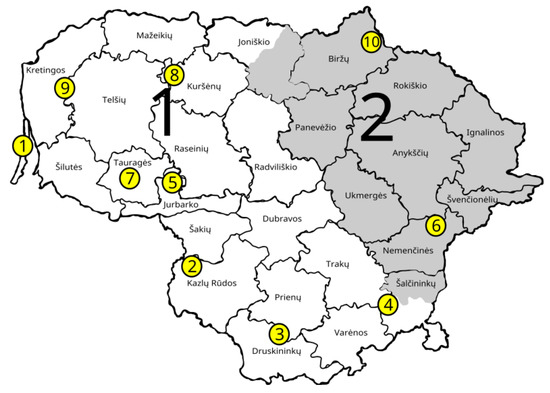 Sampling locations of natural A. glutinosa populations (GCUs) used in this study. Population names 1–JUO, 2–VIL, 3–LEI, 4–GIR, 5–SIM, 6–PUR, 7–BAT, 8–PAZ; 9–MIK; 10–SPA. White and grey areas represent different provenance regions for black alder in Lithuania.